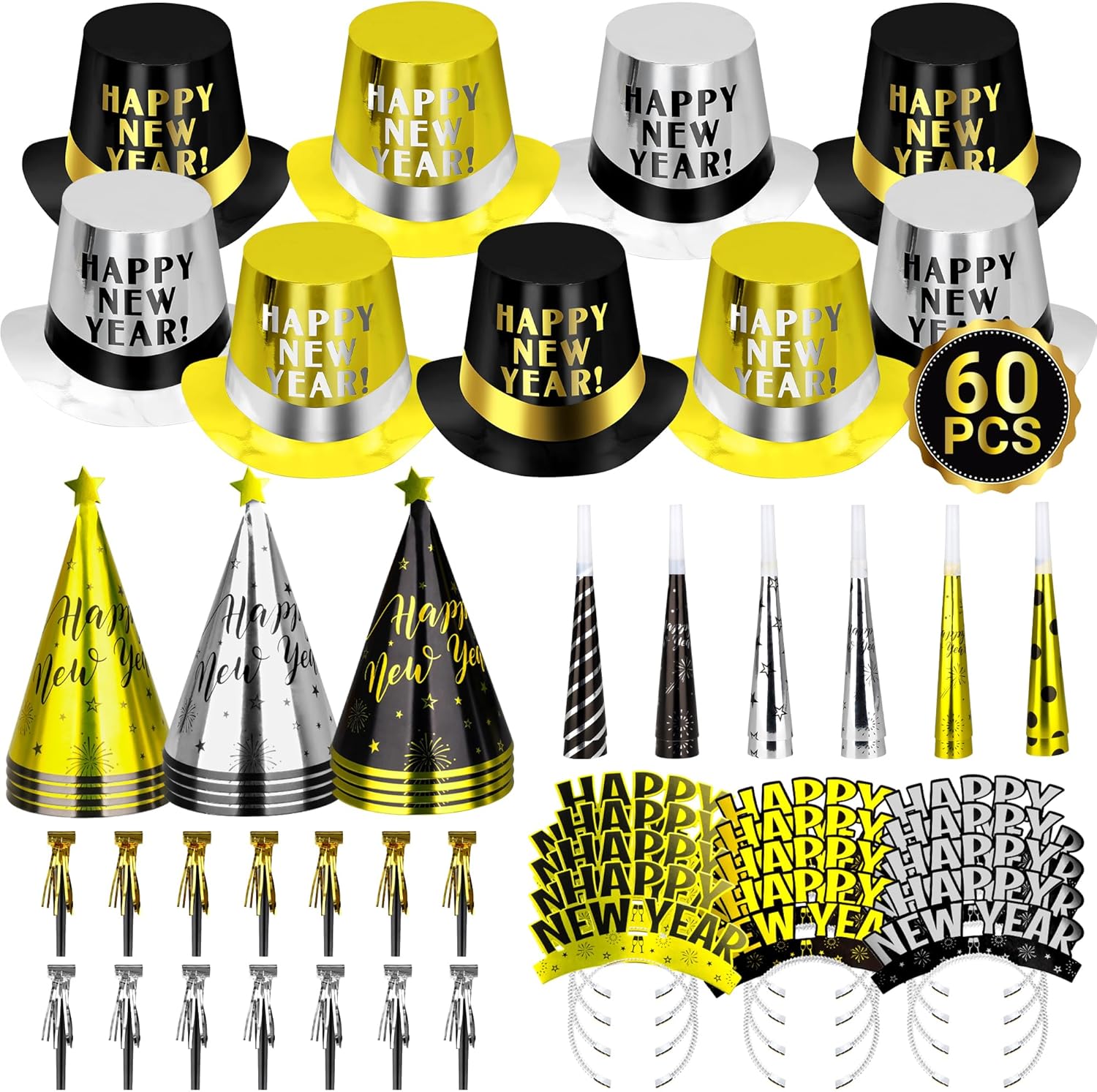 | Included Components | 10 × NYE Noise Makers, 10 × New Years Eve Horns, 6 × New Years Top Hats, 7 × NYE Party Hats, 7 × New Years Eve Party Headbands |
