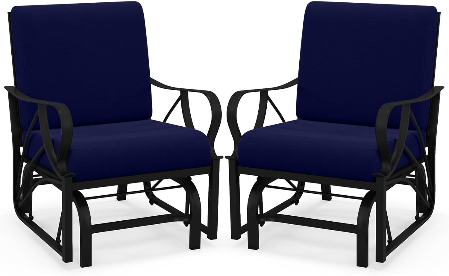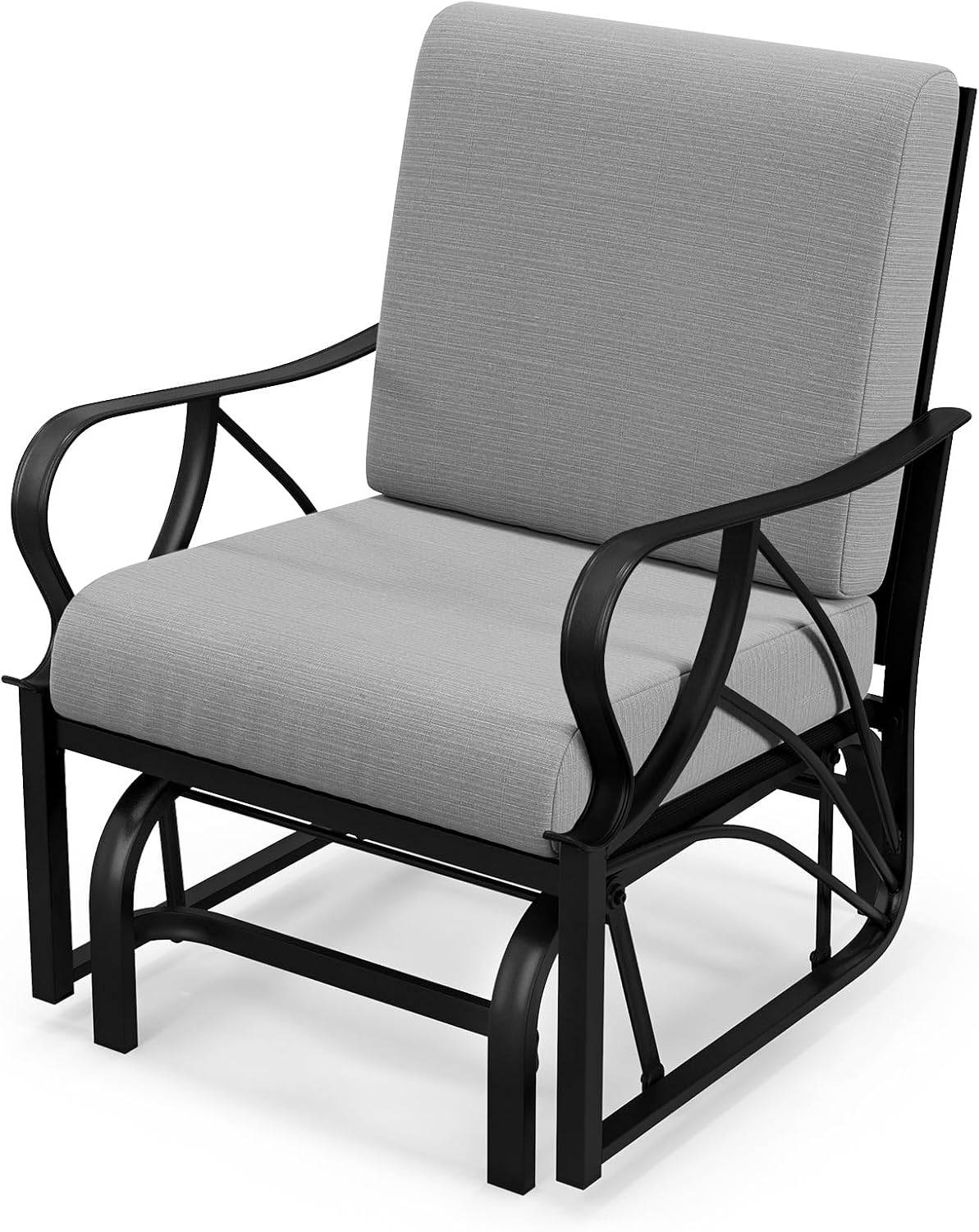 Description:If you are seeking an ideal means to enjoy your outdoor leisure time, our versatile rocking chair is an excellent option to consider. The chair is made with top-notch metal pipes that ensure its sturdiness and durability, with a weight capacity of up to 330 lbs. You can relax comfortably on this chair thanks to its ergonomic curved armrest and breathable backrest designs. Additionally, its smooth gliding mechanism ensures a safe and soothing experience. What's more, its stylish design with a unique seat pattern complements any type of outdoor space such as your garden, patio or outdoor gathering area.Features:Soft cushioning for a comfortable and relaxing seatSturdy and waterproof metal frameElegant design suitable for any outdoor spacesErgonomic armrest and backrest for added support and comfortLightweight and easy to move around for multipurpose useSmooth gliding function enhances fun in outdoor relaxing timeEasy to assemble and keep cleanSpecifications:Color: Tan/Grey/Navy/BlackMaterial: Fabric, MetalItem weight: 32 lbsOverall Dimension: 28.5"x 26" x 35"(L x W x H)Seat Height: 17.5"Weight Capacity: 330 lbs