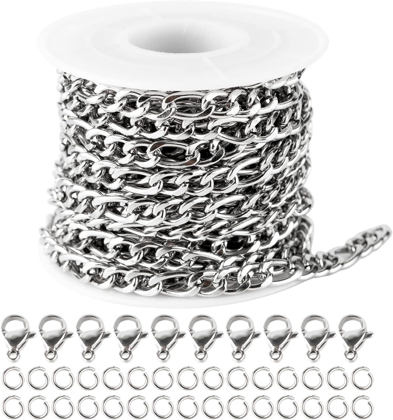 32.8 Feet Shiny Silver Plated Stainless Steel Satellite Beaded Chains for Jewelry MakingSpecification:Brand: YOUBEIYEEMaterial: 304 Stainless Steel ChainBeads Size: about 3mm diameterLength Between Two Beads: about 19mmChain Link Size: about 2.5mm long, 2mm wide, 0.5mm thickLobster Clasps Size: 10mm length, 10pcsJump Rings Size: about 4mm inner diameter, 30pcsTotal Length: 10 Meter / 32.8 FeetColor: Silver PlatedUsage: Decoration, jewelry DIY, accessories, gift ideaFeature:Premium Material: Not easy to fade, lead-free, nickel-free, allergic-free! Safe for sensitive skin.Adjustable Length: It is not finished jewelry. Cut your favorite length with jewelry wire pliers, and connect the jewelry chain with jump rings and lobster clasps.Multiple Usages: The silver beads chain for jewelry making is great for making bracelets, necklaces, earrings and other jewelry projects, jewelry repair, and crafting, also a great gift idea for your mother, wife, family, and yourself on Valentine’s Day, Mother’s Day, Christmas, birthdays, etc.Customer Service:Your satisfaction is our top priority. If you are not satisfied for any reason, you can return the item for a full refund. Feel free to contact us for any questions, we will reply to you within 24 hours.
